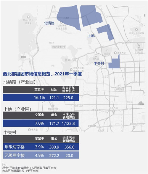 高力國際華北區(qū)董事總經(jīng)理嚴(yán)區(qū)海表示,北京作為政治文化和科技創(chuàng)新中心,也是高力國際在華北業(yè)務(wù)發(fā)展的核心據(jù)點(diǎn)。在十四五規(guī)劃進(jìn)一步明確了北京將建立國際科技創(chuàng)新中心的發(fā)展目標(biāo)后,高力國際相信,以互聯(lián)網(wǎng)科技為首的高新技術(shù)企業(yè)勢必會在北京辦公市場的供需兩端都扮演更重要的角色。受益于互聯(lián)網(wǎng)科技企業(yè)的快速擴(kuò)張和發(fā)展,中關(guān)村子市場空置率長期保持在5%以下,租金水平僅次于金融街。截止到2021年一季度,中關(guān)村甲級寫字樓市場的租金保持在381元每月每平米,空置率降至只有3.9%,整個市場處于基本飽和的狀態(tài),核心區(qū)域的優(yōu)質(zhì)寫字樓資源極度稀缺,不過未來3-4年中關(guān)村將迎來約40萬新項(xiàng)目,這會在很大程度上緩解該區(qū)域"一房難求"的現(xiàn)狀。