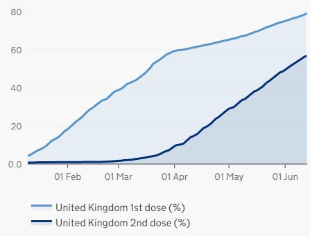 英國疫苗接種計(jì)劃正在快速有序地推進(jìn),英國政府公布的數(shù)據(jù)顯示,截至6月15日,全英已經(jīng)有超過4,169萬人(占成年人口的79.2%)注射了第一針新冠疫苗,超過2,997萬人(占成年人口的56.9%)兩針疫苗全部完成。疫苗接種計(jì)劃和疫情應(yīng)對舉措的成功,讓英國的全面解封計(jì)劃前景變得更加樂觀。如無意外,英國民眾有望在7月19日迎來全面解除防疫措施的好日子。
