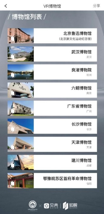 VR看展是貝殼找房在今年上線的新功能,其初心在于發(fā)揮科技的社會(huì)價(jià)值。依托博物館的線上三維重建,用戶可通過貝殼找房APP,北京、武漢、杭州、南京、廣州、長(zhǎng)沙、天津、成都、信陽(yáng)九大城市博物館的官網(wǎng)等入口進(jìn)入線上展廳,直觀、生動(dòng)地瀏覽每間展館,獲得便捷高效的“云”覽文化體驗(yàn)。
