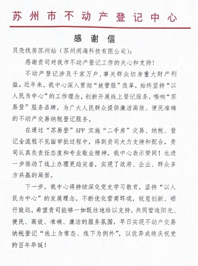 “貴司認(rèn)真負(fù)責(zé)任態(tài)度和專業(yè)敬業(yè)精神,我中心表示贊同!也進(jìn)一步推動(dòng)了線上辦理更趨完善,實(shí)現(xiàn)了政府、企業(yè)、群眾多方共贏的局面!苯,蘇州不動(dòng)產(chǎn)登記中心發(fā)來(lái)感謝信,感謝貝殼找房蘇州站在“蘇易登”APP實(shí)施“二手房”交易、納稅、登記全流程不見面審批過(guò)程中作出的突出貢獻(xiàn)。