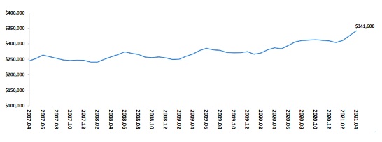 報告顯示,截止到2021年4月底,美國房屋庫存量約為116萬套,同比降低20.5%,按當前的銷售速度,庫存去化時間約為2.4個月,接近歷史最低庫存去化時間。由于房屋供應持續(xù)短缺,2021年4月全美房屋銷售量較3月有所降低,但住房需求仍然強勁,未來整體市場房價有望持續(xù)攀高。