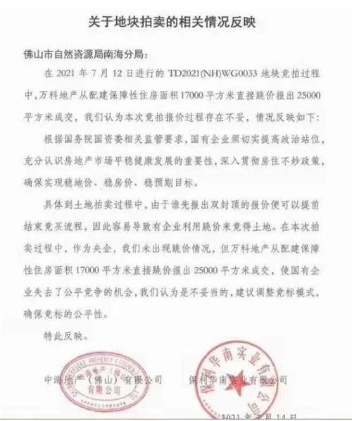 “作為央企,我們未出現(xiàn)跳價情況,但萬科地產(chǎn)從配建保障性住房面積17000平方米直接跳價報出25000平方米成交,使國有企業(yè)失去了公平競爭的機(jī)會,我們認(rèn)為是不妥當(dāng)?shù)模ㄗh調(diào)整競標(biāo)模式”。佛山市自然資源局南海分局相關(guān)負(fù)責(zé)人向記者證實(shí)了信函的真實(shí)性,并表示,“交易規(guī)則是公開透明的,中海、保利的訴求不合理,我們不予支持”。