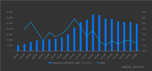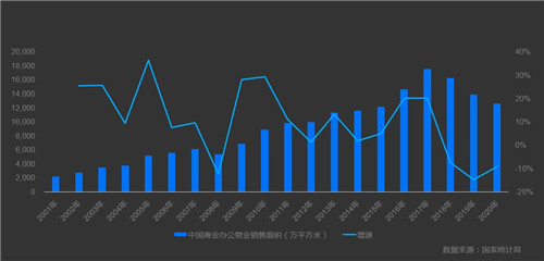 從數(shù)據(jù)來看,全國(guó)商業(yè)辦公物業(yè)總的新開工面積在2013年到達(dá)頂峰,之后連續(xù)7年都是負(fù)增長(zhǎng);從銷售的情況來看同樣如此,商業(yè)辦公物業(yè)銷售面積在2017年達(dá)到高峰是,之后連續(xù)3、4年時(shí)間一直處于下降的態(tài)勢(shì)。這是商業(yè)辦公物業(yè)總體在增量市場(chǎng)里表現(xiàn)出來的情況。
