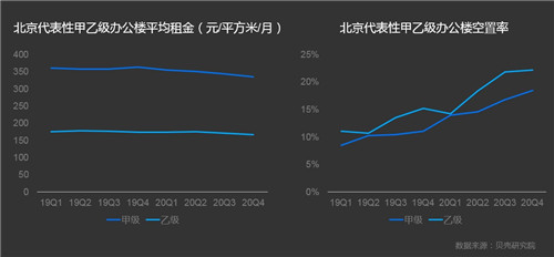 從一些微觀、中觀的角度可以分析出市場(chǎng)走勢(shì)。首先是北京重點(diǎn)商圈租金和空置的統(tǒng)計(jì),代表了市場(chǎng)的需求,得出的結(jié)論一是代表性的甲乙級(jí)寫字樓租金的水平在下降,二是空置率在上升。與此同時(shí),北京的寫字樓庫(kù)存在上升,而在2017年之后,商辦的銷售能力在下降,銷售速度在減慢。在供給不斷增加的情況下,庫(kù)存上升,進(jìn)而導(dǎo)致去化更難。不只是北京,深圳、上海這些特大城市都面臨同樣的問題:在市場(chǎng)總體供給大于需求的情況下,疊加外部對(duì)于需求的沖擊,會(huì)導(dǎo)致市場(chǎng)在去化、銷售以及運(yùn)營(yíng)等各個(gè)環(huán)節(jié)上都面臨很大的難題,這也是造成從業(yè)者當(dāng)下心理焦慮的很重要的原因。