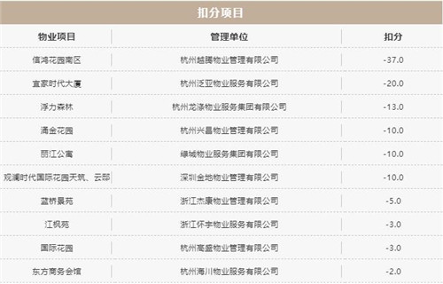 房訊網(wǎng)訊 近日,杭州市住保房管局公布了2021年第二季度物業(yè)服務(wù)項目檢查考核情況,共對509個物業(yè)管理項目進行了考核,其中,10個項目因被有關(guān)部門通報、未在規(guī)定期限內(nèi)完成整改或整改不到位等原因,分別給予2到37分的記扣分處理。