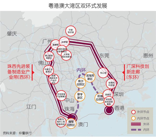 具體而言,上述軸帶式發(fā)展有效串連極點間的重要節(jié)點城市,并促成“外環(huán)”的形成,即廣深科技創(chuàng)新走廊(“東環(huán)”)和珠西先進(jìn)裝備制造產(chǎn)業(yè)帶(“西環(huán)”);以及圍繞廣州南沙、深圳前海、珠海橫琴、東莞濱海灣新區(qū)和中山翠亨新區(qū)這五個關(guān)鍵的現(xiàn)代制造業(yè)節(jié)點,沿地理走向連接成一條半環(huán)形的“內(nèi)環(huán)”發(fā)展軸帶。