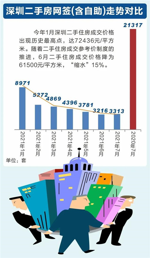 今年2月8日,深圳市住建局發(fā)布消息,建立二手住房參考價格發(fā)布機制,并發(fā)布了全市3595個小區(qū)的指導價。曾經(jīng)火爆的深圳二手房市場,在二手房參考價推出后迅速降溫,7月深圳二手房網(wǎng)簽套數(shù)同比下跌84.5%。