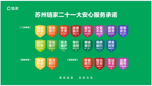 針對行業(yè)不規(guī)范作業(yè)行為,會上,蘇州鏈家發(fā)布了升級后的21大品牌服務(wù)承諾,包括“傭金差價,吃一賠三”等15項二手交易服務(wù)承諾、“陽光交易,0服務(wù)費(fèi)”等4項新房交易服務(wù)承諾、“首月解約,退換租金”等2項租賃交易服務(wù)承諾,為交易安全保駕護(hù)航。