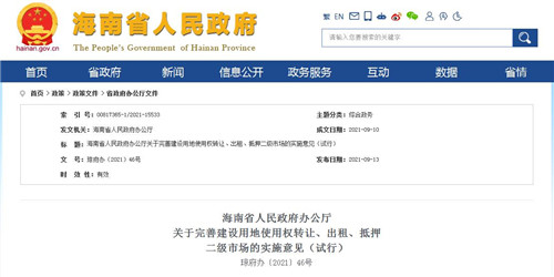 房訊網訊 9月13日,海南省人民政府發(fā)布《海南省人民政府辦公廳關于完善建設用地使用權轉讓、出租、抵押二級市場的實施意見(試行)》的通知,進一步健全和規(guī)范全省國有建設用地二級市場,促進存量建設用地集約高效利用,推進海南自由貿易港建設。