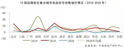 數(shù)據(jù)顯示,10強(qiáng)品牌房企近三年在重點(diǎn)城市銷(xiāo)售溢價(jià)率多分布于0-15%區(qū)間范圍內(nèi),其中2020年的平均數(shù)據(jù)為3.24%,均值比上年下降6.79個(gè)百分點(diǎn)。近年來(lái),在“房住不炒”的政策背景下,房企受到限價(jià)政策的約束,品牌房企銷(xiāo)售溢價(jià)率整體有所降低。同時(shí),2020年受新冠疫情的影響,品牌房企促銷(xiāo)力度加強(qiáng),部分房企樓盤(pán)銷(xiāo)售均價(jià)弱于上年同期。