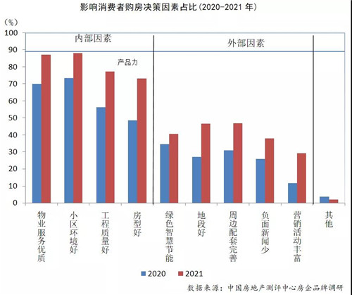 根據(jù)房企品牌調(diào)研結(jié)果顯示,2021年影響消費(fèi)者購(gòu)房決策因素中,最重要的因素是小區(qū)環(huán)境,其次是物業(yè)服務(wù)、工程質(zhì)量和房型。與2020年調(diào)研數(shù)據(jù)相比,各項(xiàng)因素重要性均有所上升。分類(lèi)來(lái)看,占比較高的四項(xiàng),即小區(qū)環(huán)境、工程質(zhì)量、房型、綠色智慧節(jié)能均圍繞產(chǎn)品本身。周邊配套、地段、負(fù)面新聞、營(yíng)銷(xiāo)活動(dòng)等因素占比則低于產(chǎn)品本身因素的影響。由此可見(jiàn),對(duì)于消費(fèi)者來(lái)說(shuō),影響決策最重要的因素就是產(chǎn)品本身,這也符合近年來(lái)房企“回歸產(chǎn)品”的趨勢(shì)。