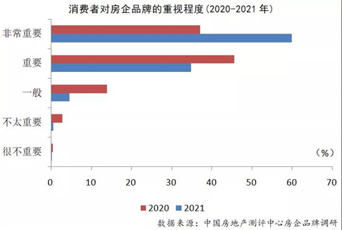 “2021房企品牌調(diào)研問(wèn)卷”數(shù)據(jù)顯示,對(duì)消費(fèi)者而言,品牌在消費(fèi)者購(gòu)房行為中起著重大的影響。2021年,在消費(fèi)者對(duì)房企品牌重視程度方面,選擇非常重要的達(dá)59.84%,而2020年僅37.10%。選擇重要的占比34.78%,選擇一般的占比4.57%,不太重要的占比0.59%,很不重要的占比為0.23%,這幾項(xiàng)均小于2020年的占比。總體看來(lái),認(rèn)為房企品牌重要的人群占比上升,消費(fèi)群體對(duì)企業(yè)品牌建設(shè)重視度有較大提高。