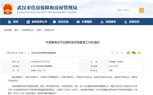 9月22日,武漢市房管局官網(wǎng)公開(kāi)《市房管局關(guān)于加強(qiáng)購(gòu)房資格管理工作的通知》,通過(guò)規(guī)范購(gòu)房資格申請(qǐng)、認(rèn)定和使用程序,推行購(gòu)房資格申請(qǐng)全程網(wǎng)上辦,加強(qiáng)對(duì)購(gòu)房資格使用情況的監(jiān)管,加大對(duì)違法違規(guī)行為的查處力度,進(jìn)一步落實(shí)國(guó)家房地產(chǎn)調(diào)控決策部署和武漢市住房限購(gòu)政策。