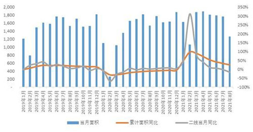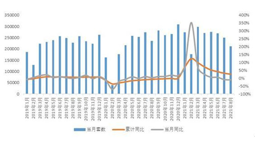 數(shù)據(jù)顯示,1-8月新房市場(chǎng)成交套數(shù)累計(jì)同比增長(zhǎng)25%,成交面積累計(jì)同比增長(zhǎng)24%,套數(shù)和面積累計(jì)同比自2月以來持續(xù)收窄。同比2020年,8月單月套數(shù)和面積同比下降10%和14%,下降幅度逐漸加大。