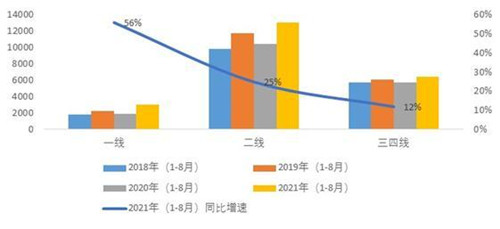 據(jù)悉,8月一線城市市場(chǎng)活躍度仍為最高,但降速放緩。同比2020年,一線、二線、三四線城市新房成交面積累計(jì)同比分別增長(zhǎng)56%、25%、12%,環(huán)比上個(gè)月分別回落8%、7%、6%,其中一線、三四線城市新房成交面積累計(jì)同比降速放緩,二線城市保持穩(wěn)定。