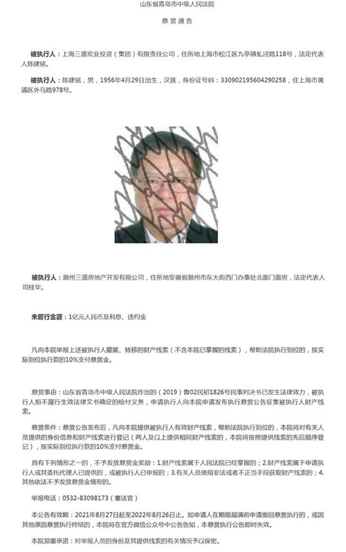 8月31日,青島市中級(jí)人民法院就上海三盛宏業(yè)投資(集團(tuán))有限責(zé)任公司、實(shí)際控制人陳建銘發(fā)布懸賞通告。
