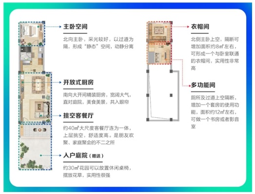 云臺朗庭室內層高大于4米,局部采用2層設計,打造復式loft格局。通過挑空空間的設計,緩解了小戶型尺度感不足的問題,也使得附加值更高,滿足了業(yè)主多樣化的家庭需求和個人愛好,衣帽間、書房、游戲室……隨心而變,得房率均超100%。