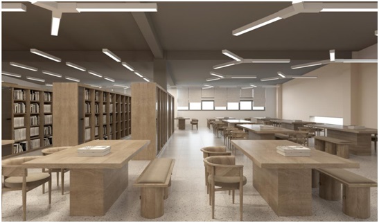 對于校園來說,濃厚的文化氣息必不可少。華遠(yuǎn)在打造南雅遠(yuǎn)航實(shí)驗(yàn)學(xué)校時(shí)面臨兩個(gè)文化主題:一是校園毗鄰的黃花機(jī)場,二是“雅禮系”王牌公辦學(xué)校,如何將兩個(gè)主題的特質(zhì)在校園中同時(shí)表達(dá)?華遠(yuǎn)以其“建筑語言”作出回應(yīng):建筑主體材質(zhì)選用磚紅色、米白色涂料,其中紅色砌塊磚部分是方正的、厚重的,隱喻著南雅中學(xué)的歷史傳承;白色部分是輕盈的、蓄勢待發(fā)的,結(jié)合形體的變化隱喻著航天科技的發(fā)展趨勢。在校園紅白色建筑之間,華遠(yuǎn)打造了豐富的異化空間,例如儀式感入口門廳、寬度變化的走廊、虛實(shí)對比的墻面、不受樓層限制的圖書空間等,這些空間可以是生發(fā)出學(xué)習(xí)的地方。