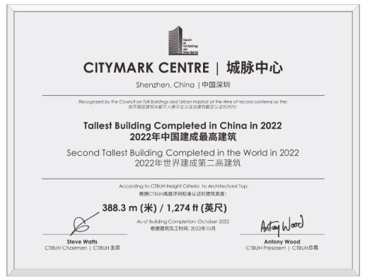 2022年10月26日,CTBUH2022全球大會于深圳城脈中心開幕。大會上,CTBUH正式認證城脈中心為“2022年中國建成最高建筑”“2022年世界建成第二高建筑”,并在全場嘉賓的見證下舉辦了揭牌儀式。