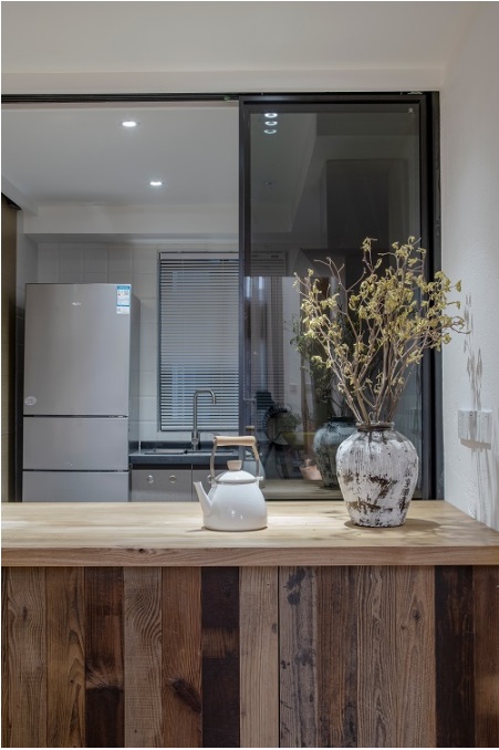 廚房設(shè)計延續(xù)原木質(zhì)調(diào)的家居搭配,加之簡約卻不簡單的擺設(shè),呈現(xiàn)出一種雅致淡泊的氣氛,給人一種舒適輕快的感覺。