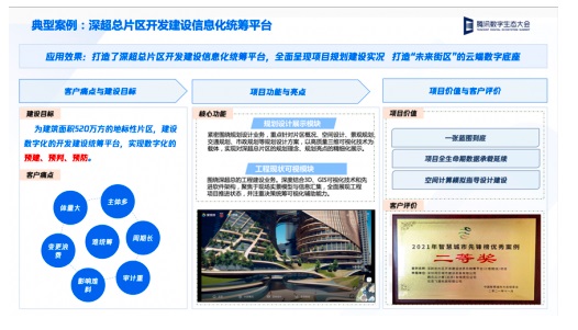 為了支撐“深超總”片區(qū)項(xiàng)目這一國(guó)際地標(biāo)級(jí)建設(shè)項(xiàng)目的開發(fā),實(shí)現(xiàn)數(shù)字化的預(yù)建、預(yù)判、預(yù)防,深灣發(fā)展通過(guò)引入騰訊WeBuild建筑云,完成了深超總片區(qū)開發(fā)建設(shè)信息化統(tǒng)籌平臺(tái)的構(gòu)建。基于WeBuild提供的數(shù)字孿生能力,該平臺(tái)打造了規(guī)劃設(shè)計(jì)展示、工程現(xiàn)狀可視化兩個(gè)核心模塊,為深超總項(xiàng)目的規(guī)劃和建設(shè)業(yè)務(wù)提供了重要支撐。據(jù)介紹,該統(tǒng)籌平臺(tái)項(xiàng)目也榮獲了2021年中國(guó)智慧城市先鋒榜優(yōu)秀案例的二等獎(jiǎng)。