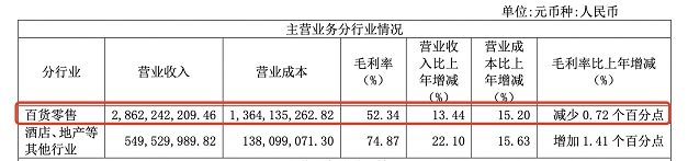 茂業(yè)商業(yè)的主營(yíng)業(yè)務(wù)包括:百貨零售;酒店、地產(chǎn)等其他行業(yè)。其中,來自百貨零售的營(yíng)收為28.62億元,同比增長(zhǎng)13.44%。不過,該項(xiàng)毛利率為52.34%,同比減少0.72個(gè)百分點(diǎn)。