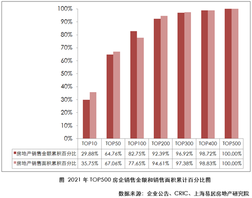 從測(cè)評(píng)結(jié)果來看,2021年TOP10 、TOP50、TOP100、TOP200銷售金額分別約占TOP500銷售金額的30%、65%、83%、92%。相較于2020年的33%、68%、82%、94%,TOP10、TOP50房企集中趨勢(shì)有所下降,主要是因?yàn)椴糠忠?guī)模房企因出現(xiàn)債務(wù)風(fēng)險(xiǎn)未入榜單或排名有大幅下滑。