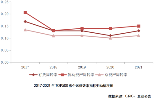 2021年TOP500房地產(chǎn)開發(fā)企業(yè)存貨周轉(zhuǎn)率均值為0.13,較2020年增加0.02;流動(dòng)資產(chǎn)周轉(zhuǎn)率均值為0.15,較2020年增加0.01;總資產(chǎn)周轉(zhuǎn)率均值為0.11,較2020年增加0.01。從三大運(yùn)營(yíng)指標(biāo)均值看,總體數(shù)據(jù)緩慢提升。