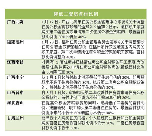 據(jù)不完全統(tǒng)計(jì),今年一季度,至少已有7城下調(diào)二套房首付比例,包括廣西北海、福建福州、江西南昌、廣西南寧、山西晉中、甘肅蘭州、河北唐山等。