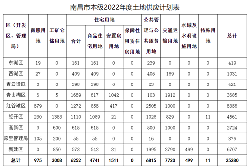 4月12日,南昌市自然規(guī)劃局公布2022年度土地供應(yīng)計劃表,市本級供地計劃總規(guī)模為25280畝,其中工礦倉儲用地3008畝,商服用地975畝,商品住宅用地4741畝,安置房用地1511畝,公共管理與公共服務(wù)用地6815畝,交通運(yùn)輸用地7720畝,水域及水利設(shè)施用地499畝,特殊用地11畝。