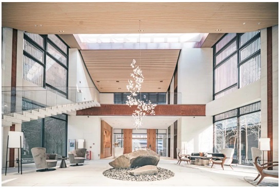 這里的精髓可以用一個(gè)詞來概括:四谷三庭。寓意一方天地間,感受四季變幻的絕美風(fēng)景,塑造三重歸家禮序。由西至東,四條綠廊與一條水軸貫穿樓宇之間,分別命名為「春之谷」、「夏之谷」、「秋之谷」和「冬之谷」,搭配種植了各個(gè)季節(jié)的時(shí)令植株。