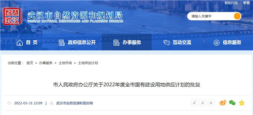 房訊網(wǎng)訊 近日,武漢市人民政府辦公廳批復(fù)武漢市自然資源和規(guī)劃局《關(guān)于審批<武漢市2022年度國(guó)有建設(shè)用地供應(yīng)計(jì)劃>的請(qǐng)示》,原則同意2022年度全市國(guó)有建設(shè)用地供應(yīng)計(jì)劃為71079畝。其中,中心城區(qū)計(jì)劃供應(yīng)土地面積為16630畝,東湖高新區(qū)、武漢經(jīng)開區(qū)和新城區(qū)計(jì)劃供應(yīng)土地面積為54449畝。