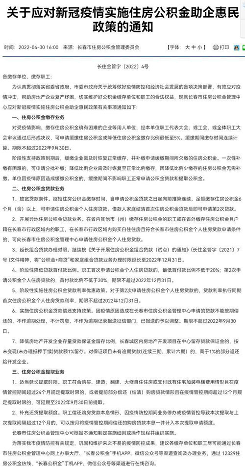 4月30日,長春市住房公積金管理委員會發(fā)布了《關(guān)于應(yīng)對新冠疫情實(shí)施住房公積金助企惠民政策的通知》。