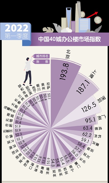 當(dāng)前,各行各業(yè)已為中國(guó)的城市發(fā)展研究提出了多樣的概念和指標(biāo),比如宜居指數(shù)、夜生活指數(shù)、人才指數(shù)等。記者今日獲悉,針對(duì)商務(wù)辦公樓宇對(duì)城市發(fā)展的數(shù)據(jù)和分析尚且不足這一現(xiàn)狀,仲量聯(lián)行近日發(fā)布了中國(guó)40城辦公樓市場(chǎng)指數(shù)。該指數(shù)選取全國(guó)政治經(jīng)濟(jì)重點(diǎn)城市,涵蓋了辦公樓市場(chǎng)的體量、運(yùn)營(yíng)指標(biāo)和財(cái)務(wù)指標(biāo),是城市高品質(zhì)辦公樓商業(yè)價(jià)值的量化,直觀反映了樓宇的經(jīng)營(yíng)情況(出租率)和市場(chǎng)主體的承付能力(租金)。結(jié)果顯示,2022年第一季度中國(guó)40城辦公樓市場(chǎng)指數(shù),成都排名僅次于北京、上海、深圳和廣州,位列全國(guó)第五。