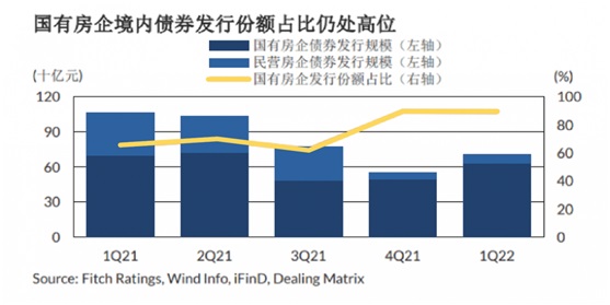 惠譽評級統(tǒng)計顯示,2022年一季度,國有房地產(chǎn)企業(yè)發(fā)債份額占比接近90%,相較于2021年有了較大幅度的提升,這充分說明在當(dāng)前形勢下,房企信用狀況持續(xù)分化,國企融資具備先天優(yōu)勢。