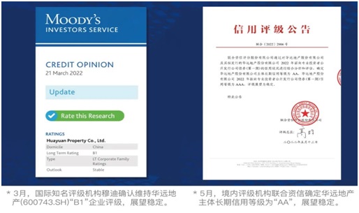也正是基于如此良好的企業(yè)信譽,使得華遠在市場下行周期,依然能夠獲得國際評級機構(gòu)的認可。2021年,穆迪、標(biāo)普、惠譽三大國際評級機構(gòu)大規(guī)模下調(diào)房企評級,下調(diào)次數(shù)達127次,僅9、10兩個月就高達40余次。而在今年3月,穆迪對華遠地產(chǎn)繼續(xù)保持“B1”企業(yè)評級,展望穩(wěn)定。5月,境內(nèi)評級機構(gòu)聯(lián)合資信確定華遠地產(chǎn)主體長期信用等級為“AA”,展望穩(wěn)定。