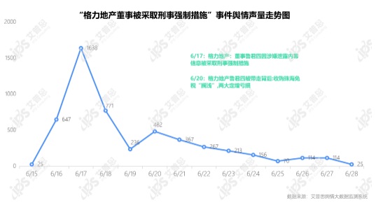 艾普思輿情大數(shù)據(jù)監(jiān)測系統(tǒng)顯示,“格力地產(chǎn)董事被采取刑事強制措施”事件輿情聲量為5,125篇次,聲量峰值出現(xiàn)在6月17日(單日聲量1638篇次);輿情聲量在格力地產(chǎn)發(fā)布公告后急劇上升,于17日達到峰值后迅速回落。
