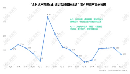 艾普思輿情大數(shù)據(jù)監(jiān)測系統(tǒng)顯示,“金科地產(chǎn)票據(jù)兌付違約致股權(quán)被凍結(jié)”事件輿情聲量為3,501篇次,第一個小高峰出現(xiàn)在6月9日,自金科地產(chǎn)回應(yīng)關(guān)注函后,聲量峰值出現(xiàn)在6月13日(單日聲量676篇次),隨后輿情聲量迅速回落,至6月18日降至29篇次,此后輿情熱度在小范圍內(nèi)波動。