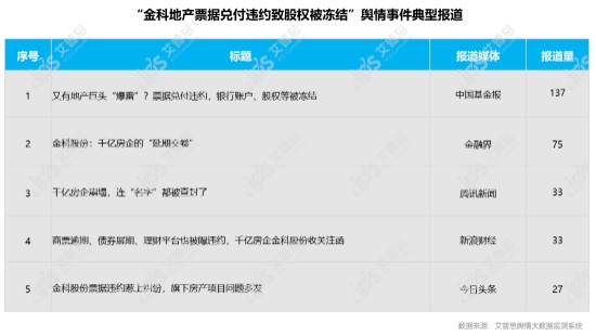 關(guān)于“金科地產(chǎn)票據(jù)兌付違約致股權(quán)被凍結(jié)”輿情事件的典型報道包括《又有地產(chǎn)巨頭“爆雷”?票據(jù)兌付違約,銀行賬戶、股權(quán)等被凍結(jié)》《金科股份:千億房企的“延期交卷”》《千億房企崩塌,連“名字”都被查封了》等,報道量排名前五的信息為: