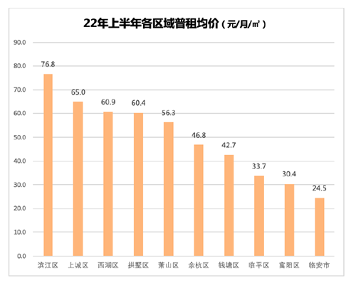 在各區(qū)域中,上市公司云集的濱江區(qū)租金最高,達(dá)到了76.8元/㎡/月,其次是配套最為成熟的上城區(qū)、西湖區(qū)和拱墅區(qū),月租金都超過了60元/㎡/月。