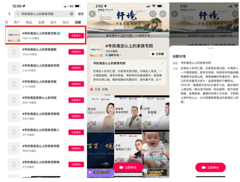 雙方圍繞為圓明天頌的定制話題:尋找“海淀心上的家族宅院”。發(fā)動(dòng)品牌與用戶的多方參與,進(jìn)行內(nèi)容發(fā)散,吸引了1W+視頻參與,帶來了1192W的曝光,互動(dòng)量達(dá)89.6W。