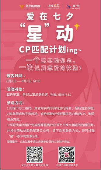 除了線下的節(jié)日驚喜,越秀星寓&星鄰還特別創(chuàng)意推出“七夕星動(dòng)CP匹配計(jì)劃”,為在住單身租客進(jìn)行線上CP匹配,鋪架七夕浪漫“鵲橋”,幫助解決脫單問題。本次活動(dòng)避免了線下聯(lián)誼的尷尬和網(wǎng)絡(luò)交友的真實(shí)性問題,由越秀星寓、星鄰充當(dāng)愛情月老,既能核實(shí)報(bào)名者的真實(shí)身份,根據(jù)報(bào)名者的籍貫、年齡、職業(yè)、愛好及意向CP要求等進(jìn)行多維度匹配,為大家提供一個(gè)可信賴的相識平臺,讓年輕人在這里相遇、相識、相知、相戀!靶莿(dòng)CP匹配計(jì)劃”一推出,就深受星友們的歡迎,當(dāng)天就有30多位報(bào)名!