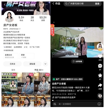 “在珠三角地區(qū),快手的直播賣房真的行得通嗎?賬號流量效果向好,后續(xù)真的會有可觀的生意轉(zhuǎn)化嗎?”2022年底,廣州房產(chǎn)主播“房產(chǎn)女老板”(快手ID:2948783368)盧文清在快手運(yùn)營了大半年,粉絲量就超過了2.3萬,即便心里藏著不少對快手房產(chǎn)生意轉(zhuǎn)化的疑慮,但盧文清依舊堅(jiān)持對快手運(yùn)營下功夫。