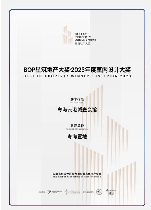 12月10日,經(jīng)全球設(shè)計(jì)領(lǐng)袖人物組成的組委會(huì)嚴(yán)苛評(píng)選,粵海云港城·壹會(huì)館榮膺“BOP星筑地產(chǎn)大獎(jiǎng)·2023年度室內(nèi)設(shè)計(jì)大獎(jiǎng)”。以代表中國(guó)塔尖圈層的生活美學(xué)空間,征服世界設(shè)計(jì)大師的挑剔眼光,彰顯引領(lǐng)世界人居風(fēng)尚的影響力。