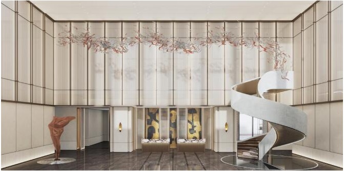 壹會(huì)館之內(nèi),10米挑高大堂,營(yíng)造闊綽的空間氣場(chǎng),將代表嶺南豪門望族審美并深受歐洲宮廷貴族青睞的粵繡融入其中,深厚的人文底蘊(yùn)與現(xiàn)代藝術(shù)雕塑、旋轉(zhuǎn)樓梯等巧妙設(shè)計(jì)結(jié)合,讓會(huì)館空間成為高階審美與塔尖品位的第一現(xiàn)場(chǎng)。