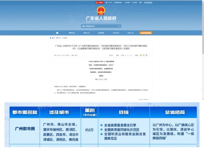 12月20日,《廣州都市圈發(fā)展規(guī)劃》正式頒布,由廣州引領(lǐng),涵蓋佛山市全域,肇慶市端州區(qū)、鼎湖區(qū)、高要區(qū)、四會市,清遠(yuǎn)市清城區(qū)、清新區(qū)、佛岡縣,旨在構(gòu)建粵港澳大灣區(qū)高質(zhì)量發(fā)展主引擎、同城示范區(qū)、全國制造業(yè)和服務(wù)業(yè)融合發(fā)展典范區(qū)。