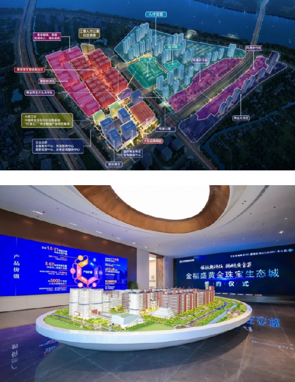 金福盛總投資約300億元,規(guī)劃用地面積約1600畝,總建筑面積約265萬㎡,在佛山倫教建造以“黃金珠寶+智能制造+數(shù)字經(jīng)濟(jì)”三核為驅(qū)動,致力于發(fā)展成為智能制造、高端裝備智造、創(chuàng)意設(shè)計、珠寶展銷、品牌發(fā)布、商務(wù)會展、產(chǎn)業(yè)孵化、創(chuàng)新金融服務(wù)、新零售電商、文旅休閑等全產(chǎn)業(yè)鏈功能為一體的產(chǎn)城融合人文城市標(biāo)桿,實現(xiàn)產(chǎn)業(yè)鏈數(shù)字化運營和智能制造的高質(zhì)量發(fā)展。