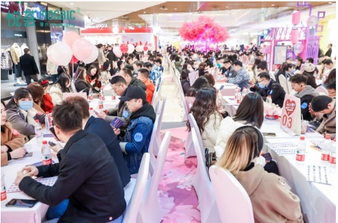 “Nice 兔 meet you”相親活動(dòng)位于重慶悅薈購(gòu)物中心LG中庭,寬敞明亮的同時(shí)布置得十分溫馨浪漫,象征著甜蜜色彩的氣球在場(chǎng)內(nèi)輕輕搖曳,桌上絢爛的玫瑰花芬芳迷人。