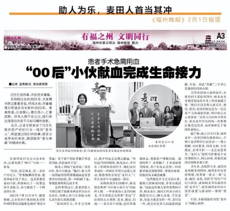 報(bào)道中的主人公,是來(lái)自福州麥田房產(chǎn)金山中心區(qū) 金山小店B店的楊龍。2022年7月,這位00后小伙,當(dāng)?shù)弥獦I(yè)主的家人在醫(yī)院急需獻(xiàn)血,他和店里的另一名伙伴滕超麗第一時(shí)間響應(yīng),前往醫(yī)院義務(wù)獻(xiàn)血,收獲了業(yè)主家人的由衷感謝:“是你們救了我母親的生命”。