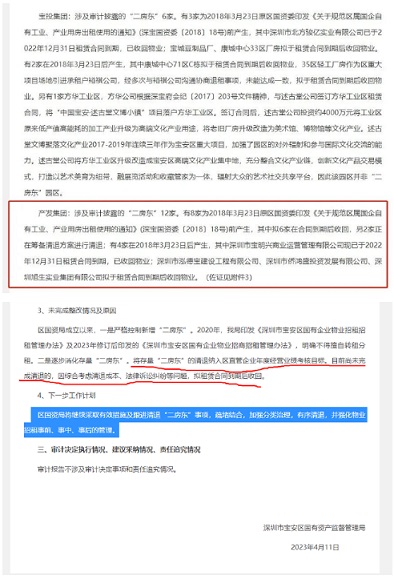 產(chǎn)發(fā)集團(tuán)涉及審計(jì)披露的“二房東”12家。有8家為2018年3月23日原區(qū)國資委印發(fā)《關(guān)于規(guī)范區(qū)屬國企自有工業(yè)、產(chǎn)業(yè)用房出租使用的通知》(深寶國資委〔2018〕18號(hào))前產(chǎn)生,其中擬6家在合同到期后收回,另2家正在籌備清退方案進(jìn)行清退;有4家在2018年3月23日后產(chǎn)生,其中深圳市寶明興商業(yè)運(yùn)營管理有限公司現(xiàn)已于2022年12月31日租賃合同到期,已收回物業(yè);深圳市泓德寶建設(shè)工程有限公司、深圳市僑鴻盛投資發(fā)展有限公司、深圳旭生實(shí)業(yè)集團(tuán)有限公司擬于租賃合同到期后收回物業(yè)。